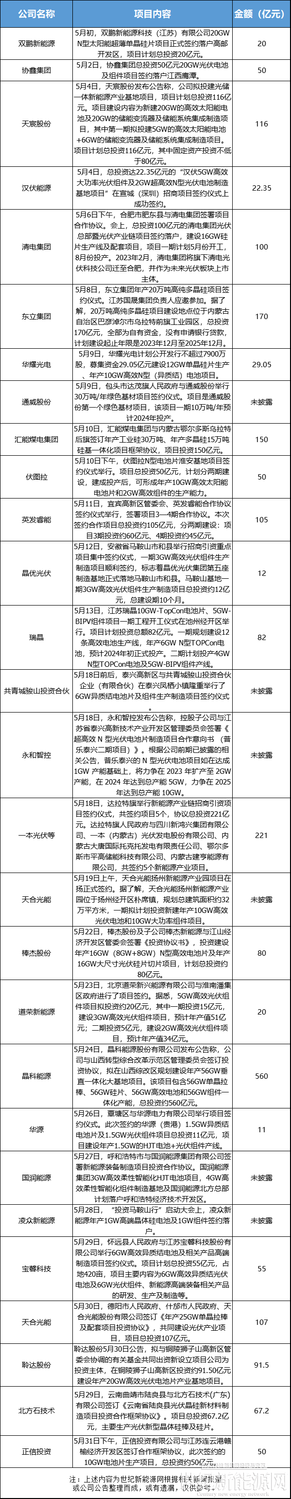 5月份光伏行业再创投资新高,总投超2170亿。据世纪新能源网统计,5月份扩产或投资等项目达28个,仅落后于2月份的32个项目,但投资额创前五个月新高。