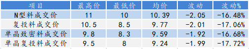 近期来看,硅料价格呈快速下跌趋势,下跌速度超预期。6月8日,中国有色金属工业协会硅业分会公布了最新硅料数据,上周硅料市场扩大跌幅。单晶复投料成交均价9.24万元/吨,周环比降幅17.72%;单晶致密料成交均价为9.59万元/吨,周环比降幅为16.68%;国内N型料成交均价为10.39万元/吨,周环比降幅为16.48%;复投料成交均价为9.77万元/吨,周环比降幅17.06%。