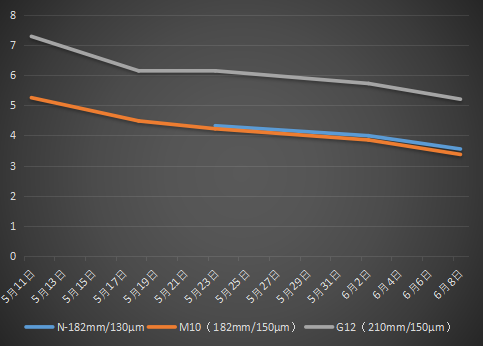 据硅业分会分析,上周多晶硅价格扩大跌幅,主要是由硅料需求减少、企业延迟扩产、上下游博弈加剧造成的。同时,硅片环节库存的不减反增使得单晶硅片价格加速下降。从市场端来看,也不断有企业下调硅片价格。5月底,硅片龙头隆基绿能公示最新的硅片价格,“单晶硅片P型M10 150μm厚度”单晶硅片价格由6.3元人民币下调至4.36元,降幅30.8%;“单晶硅片P型M6 150μm厚度”单晶硅片价格由至5.44元人民币下调至3.81元人民币,降幅30%。6月1日,TCL公布新一轮硅片价格,相较5月11日公布的硅片价格,此轮报价相较于5月11日报价再度下调。这已经是TCL在不到一个月的时间第三次下调硅片价格。市场上其他硅片企业价格基本也跟跌价格。整体来看,5月产业链价格整体快速下滑,主要由于上游产出加大叠加下游观望情绪加重导致的阶段性需求下降。受此影响,加上当前组件库存约有1-2个月不等的水平,多家机构预测,未来一段时间内,组件整体价格仍有降价空间。 |