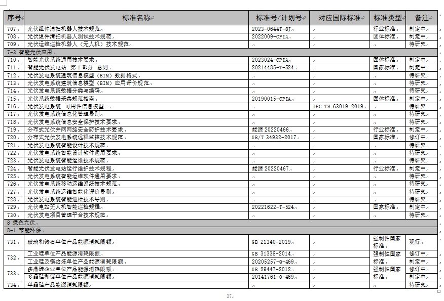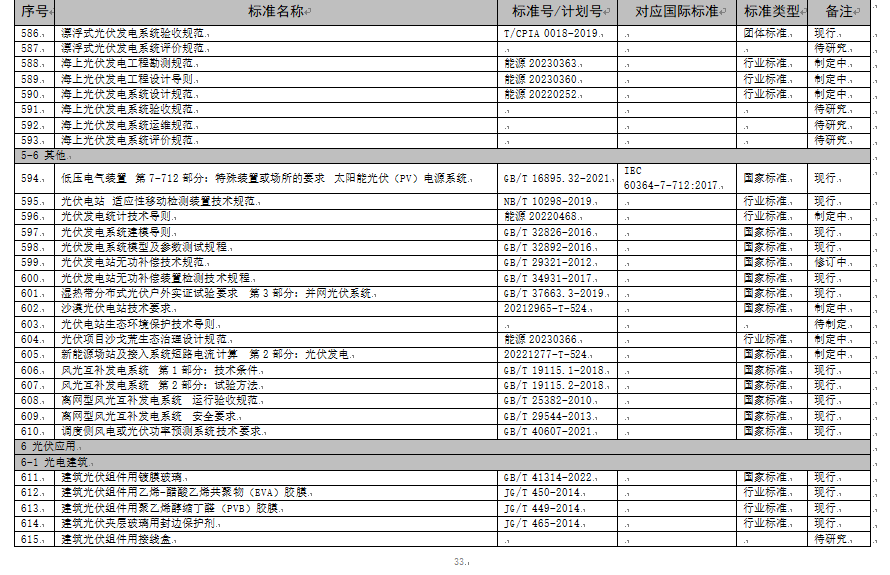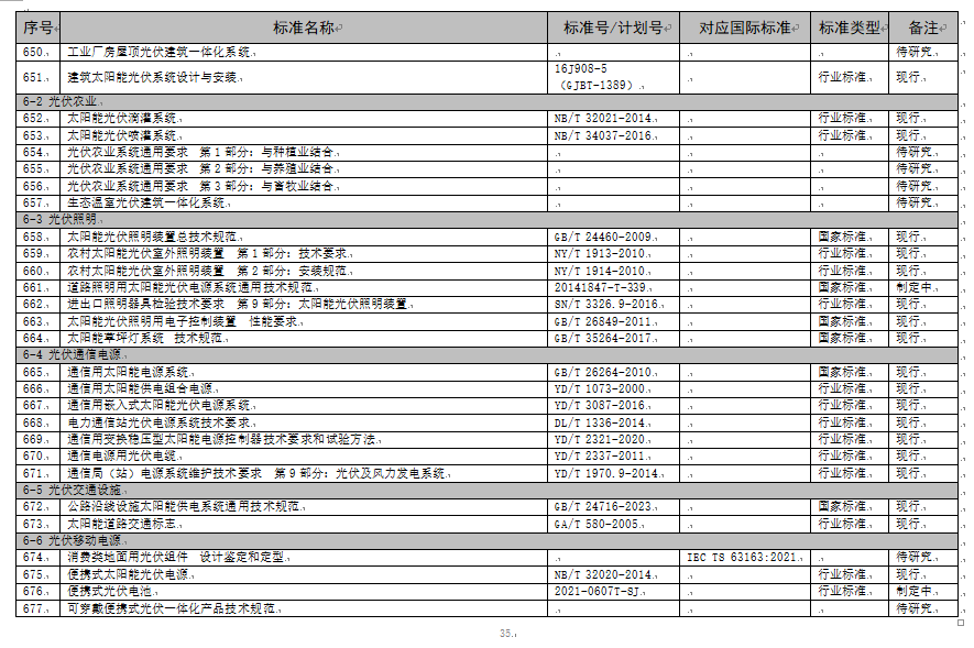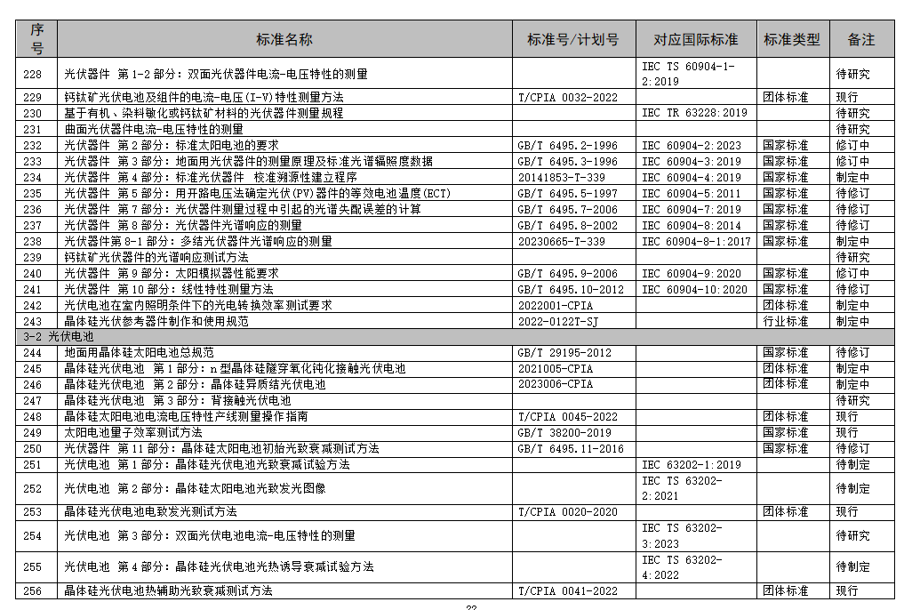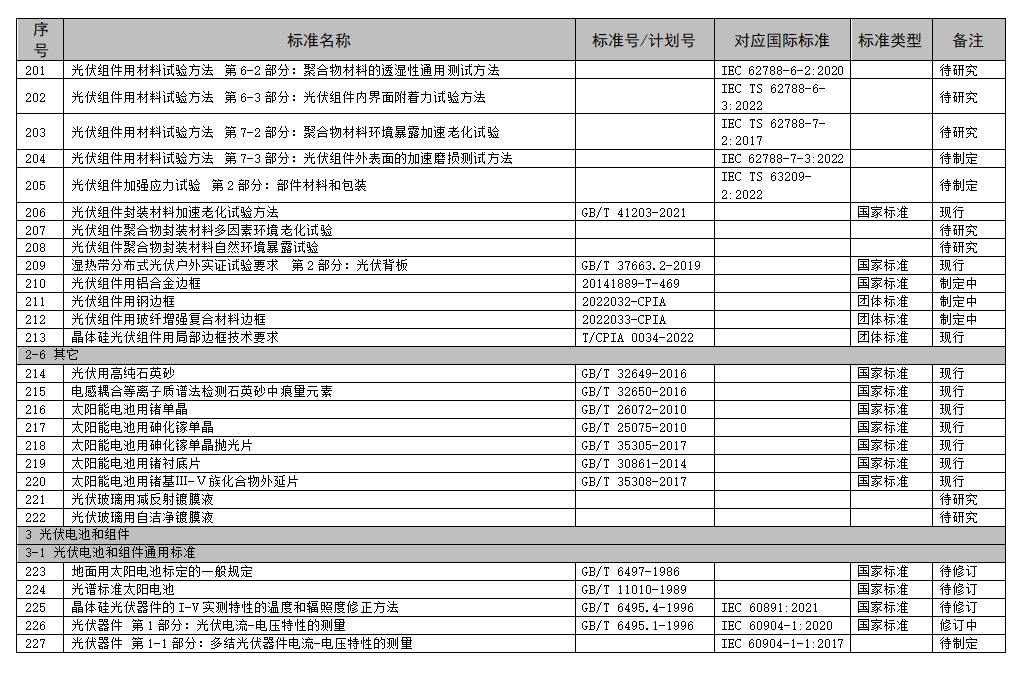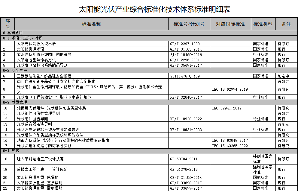 (三)体系内容 1.基础通用标准 基础通用标准包括术语、定义、标识,质量管理和安全生产等方面的相关标准,涵盖光伏产业的基础、共性、综合、通用标准,对产业链各环节具有普遍的适用性和通用性。 (1)术语、定义、标识标准:主要包括光伏产业专用的术语、定义和标识标准,用于统一光伏产业相关概念,为光伏标准体系提供支撑; (2)安全生产标准:主要包括光伏制造和光伏发电工程的安全生产的相关标准,用于指导光伏制造的安全生产; (3)质量管理标准:主要包括光伏制造和光伏发电工程质量管理的相关标准,包括质量体系、可信性管理、监造等标准。 2.光伏制造设备标准 光伏制造设备标准包括硅材料生产加工设备、电池制造设备、组件制造设备和测试设备等方面的相关标准。 (1)硅材料生产加工设备标准:主要包括多晶硅、拉棒/铸锭、开方、切片等环节生产加工设备的相关标准; (2)电池制造设备标准:主要包括扩散炉、刻蚀机、PECVD等晶体硅和薄膜光伏电池制造设备的相关标准; (3)组件制造设备标准:主要包括层压机、焊接机等光伏组件制造设备的相关标准; (4)测试设备标准:主要包括太阳模拟器、电致发光缺陷检测仪、量子效率测试仪等测试设备的相关标准。 3.光伏材料标准 光伏材料标准包括晶体硅材料、薄膜半导体材料、工艺材料、电极材料和封装材料等方面的相关标准,覆盖生产光伏电池和光伏组件所用到的原材料和工艺材料。 (1)晶体硅材料标准:主要包括多晶硅、硅棒、硅锭、硅片、硅粉等光伏用晶体硅材料的相关标准; (2)薄膜半导体材料标准:主要包括靶材和衬底等薄膜光伏电池所需材料的相关标准; (3)工艺材料标准:主要包括切割线、丝网、助焊剂等在光伏产品制造过程中用到的工艺材料相关标准,这些工艺材料通常不作为产品的组成部分; (4)电极材料标准:指在电池及组件上用于收集载流子和传输电流的电极材料,主要包括浆料、焊带、导电胶等相关标准; (5)封装材料标准:主要包括光伏玻璃、光伏背板、光伏封装胶膜、密封胶等光伏组件封装用材料的相关标准。 4.光伏电池和组件标准 光伏电池和组件标准包括光伏器件、光伏电池、光伏组件的测量方法、产品要求、性能评价和测试方法等相关标准。 (1)光伏电池和组件通用标准:以国标GB/T 6495(IEC 60904)系列标准为主,主要包括光伏器件通用测量要求等相关标准; (2)光伏电池标准:主要包括光伏电池的产品标准、测试标准、工艺规程标准等相关标准; (3)光伏组件标准:主要包括光伏组件产品标准、性能测试标准、可靠性测试标准等,范围覆盖晶体硅光伏组件和薄膜光伏组件。 5.光伏部件标准 光伏部件标准包括电气部件和器件、支撑结构和部件、光储部件等方面的相关标准。 (1)电气部件和器件标准:指光伏系统所用的电气部件及其零部件和元器件的标准,主要包括光伏逆变器、汇流箱、控制器、光伏电缆和接线盒等相关标准; (2)支撑结构和部件标准:主要包括光伏支架、跟踪器、浮体等光伏系统所用的支撑结构和部件的相关标准; (3)光储部件标准:指光伏与储能结合的光储系统所用的电气部件相关标准。 6.光伏发电系统标准 光伏发电系统标准包括并网发电系统、独立发电系统、光储系统、光伏制氢系统和水上光伏系统等方面的相关标准。 (1)并网发电系统标准:主要包括并网光伏发电系统的工程规程、技术要求、测试评估、监测预测、项目管理等相关标准; (2)独立发电系统标准:独立光伏系统也称离网光伏系统,主要包括独立光伏系统、光伏提水系统等相关标准; (3)光储系统标准:指光伏与储能结合的光储系统标准,主要包括光储系统设计、验收、运维、性能评价等相关标准; (4)光伏制氢系统标准:指利用光伏能源制氢的光伏制氢系统相关标准,主要包括接口标准和安全要求等标准; (5)水上光伏系统标准:主要包括水上光伏系统和海上光伏系统的相关标准。 7.光伏应用标准 光伏应用标准包括光电建筑、光伏农业、光伏照明、光伏通信电源、光伏交通设施、光伏移动能源、光伏直驱电器等相关标准。 (1)光电建筑标准:指光伏与建筑结合的相关标准,主要包括产品标准、测试标准和系统标准,标准范围涵盖BAPV和BIPV; (2)光伏农业标准:指光伏与农业相结合的相关标准,主要包括光伏与种殖业、林业、畜牧业、渔业等领域结合的标准; (3)光伏照明标准:指光伏能源用于照明领域的相关标准,主要包括光伏路灯、草坪灯等产品的标准; (4)光伏通信电源标准:指光伏能源用于通信电源的相关标准; (5)光伏交通设施标准:指光伏能源用于交通信号灯等交通设施的相关标准; (6)光伏移动电源标准:指光伏能源用于移动能源的相关标准,主要包括便携式光伏电源、可穿戴光伏设备和光伏车辆一体化的标准; (7)光伏直驱电器标准:主要包括光伏直驱空调、光伏直驱热泵等以光伏能源直流驱动电器的相关标准。 8.智能光伏标准 智能光伏标准包括光伏智能制造、智能光伏产品和智能光伏应用的相关标准。 (1)光伏智能制造标准:主要包括光伏产业智能制造有关的数据、通信、信息安全、信息标识、智能工厂、智慧供应链等相关标准; (2)智能光伏产品:主要包括智能光伏组件、智能逆变器、智能跟踪器、智能清扫机器人等智能化光伏产品的相关标准; (3)智能光伏应用:指光伏发电系统智能化应用的相关标准