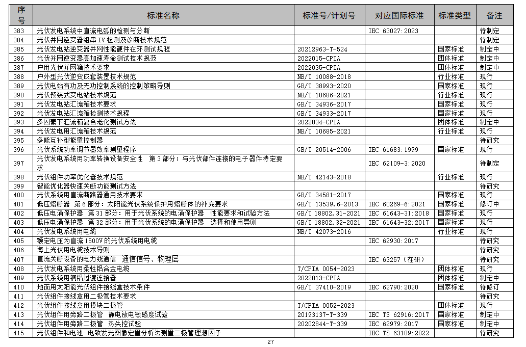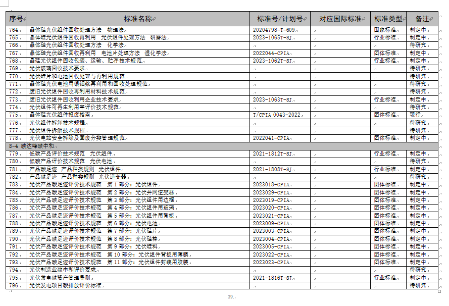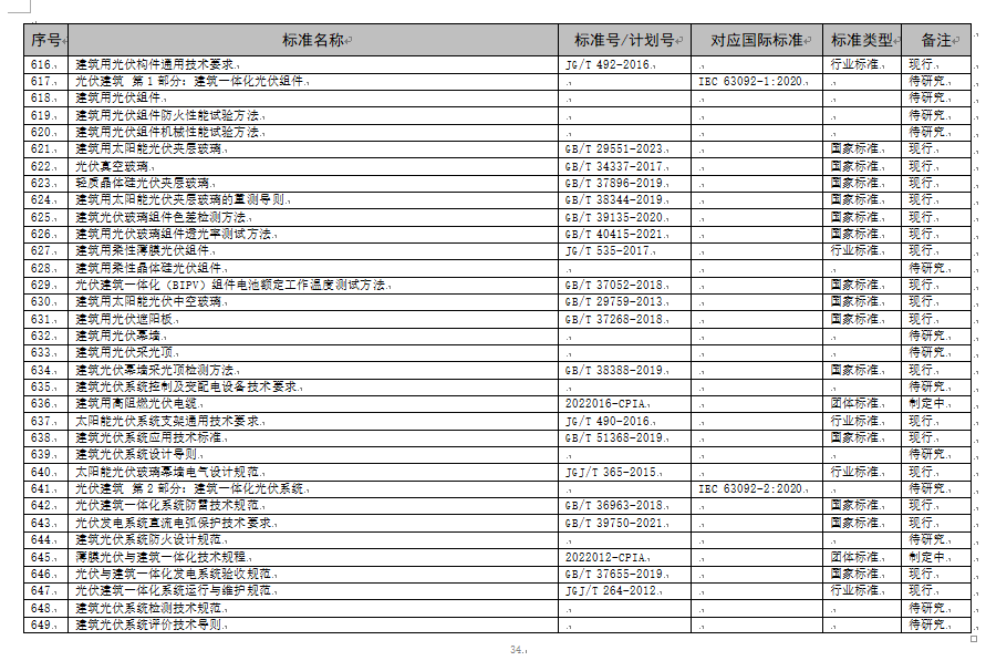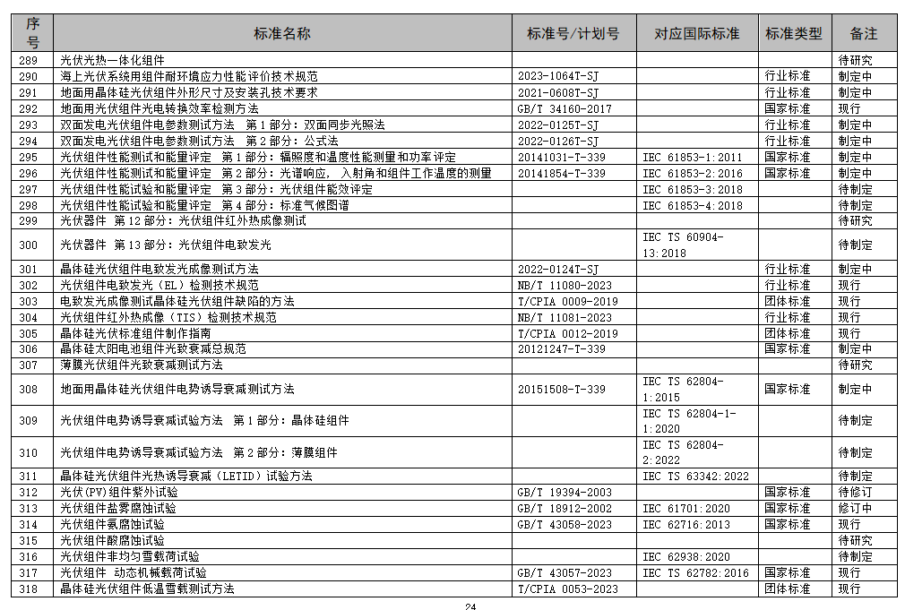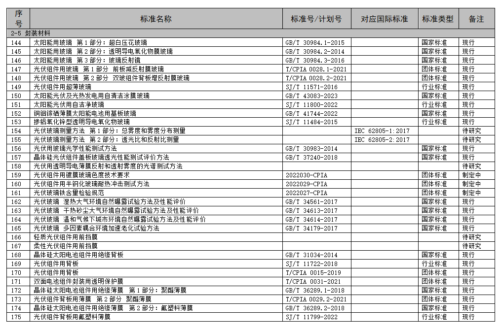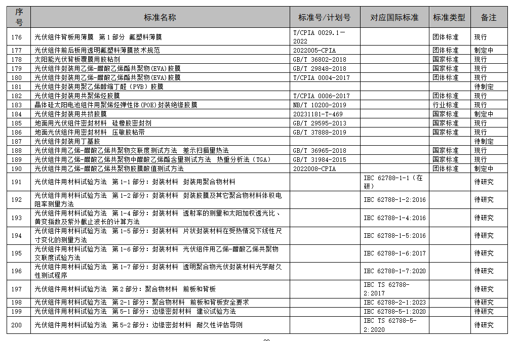 (三)体系内容 1.基础通用标准 基础通用标准包括术语、定义、标识,质量管理和安全生产等方面的相关标准,涵盖光伏产业的基础、共性、综合、通用标准,对产业链各环节具有普遍的适用性和通用性。 (1)术语、定义、标识标准:主要包括光伏产业专用的术语、定义和标识标准,用于统一光伏产业相关概念,为光伏标准体系提供支撑; (2)安全生产标准:主要包括光伏制造和光伏发电工程的安全生产的相关标准,用于指导光伏制造的安全生产; (3)质量管理标准:主要包括光伏制造和光伏发电工程质量管理的相关标准,包括质量体系、可信性管理、监造等标准。 2.光伏制造设备标准 光伏制造设备标准包括硅材料生产加工设备、电池制造设备、组件制造设备和测试设备等方面的相关标准。 (1)硅材料生产加工设备标准:主要包括多晶硅、拉棒/铸锭、开方、切片等环节生产加工设备的相关标准; (2)电池制造设备标准:主要包括扩散炉、刻蚀机、PECVD等晶体硅和薄膜光伏电池制造设备的相关标准; (3)组件制造设备标准:主要包括层压机、焊接机等光伏组件制造设备的相关标准; (4)测试设备标准:主要包括太阳模拟器、电致发光缺陷检测仪、量子效率测试仪等测试设备的相关标准。 3.光伏材料标准 光伏材料标准包括晶体硅材料、薄膜半导体材料、工艺材料、电极材料和封装材料等方面的相关标准,覆盖生产光伏电池和光伏组件所用到的原材料和工艺材料。 (1)晶体硅材料标准:主要包括多晶硅、硅棒、硅锭、硅片、硅粉等光伏用晶体硅材料的相关标准; (2)薄膜半导体材料标准:主要包括靶材和衬底等薄膜光伏电池所需材料的相关标准; (3)工艺材料标准:主要包括切割线、丝网、助焊剂等在光伏产品制造过程中用到的工艺材料相关标准,这些工艺材料通常不作为产品的组成部分; (4)电极材料标准:指在电池及组件上用于收集载流子和传输电流的电极材料,主要包括浆料、焊带、导电胶等相关标准; (5)封装材料标准:主要包括光伏玻璃、光伏背板、光伏封装胶膜、密封胶等光伏组件封装用材料的相关标准。 4.光伏电池和组件标准 光伏电池和组件标准包括光伏器件、光伏电池、光伏组件的测量方法、产品要求、性能评价和测试方法等相关标准。 (1)光伏电池和组件通用标准:以国标GB/T 6495(IEC 60904)系列标准为主,主要包括光伏器件通用测量要求等相关标准; (2)光伏电池标准:主要包括光伏电池的产品标准、测试标准、工艺规程标准等相关标准; (3)光伏组件标准:主要包括光伏组件产品标准、性能测试标准、可靠性测试标准等,范围覆盖晶体硅光伏组件和薄膜光伏组件。 5.光伏部件标准 光伏部件标准包括电气部件和器件、支撑结构和部件、光储部件等方面的相关标准。 (1)电气部件和器件标准:指光伏系统所用的电气部件及其零部件和元器件的标准,主要包括光伏逆变器、汇流箱、控制器、光伏电缆和接线盒等相关标准; (2)支撑结构和部件标准:主要包括光伏支架、跟踪器、浮体等光伏系统所用的支撑结构和部件的相关标准; (3)光储部件标准:指光伏与储能结合的光储系统所用的电气部件相关标准。 6.光伏发电系统标准 光伏发电系统标准包括并网发电系统、独立发电系统、光储系统、光伏制氢系统和水上光伏系统等方面的相关标准。 (1)并网发电系统标准:主要包括并网光伏发电系统的工程规程、技术要求、测试评估、监测预测、项目管理等相关标准; (2)独立发电系统标准:独立光伏系统也称离网光伏系统,主要包括独立光伏系统、光伏提水系统等相关标准; (3)光储系统标准:指光伏与储能结合的光储系统标准,主要包括光储系统设计、验收、运维、性能评价等相关标准; (4)光伏制氢系统标准:指利用光伏能源制氢的光伏制氢系统相关标准,主要包括接口标准和安全要求等标准; (5)水上光伏系统标准:主要包括水上光伏系统和海上光伏系统的相关标准。 7.光伏应用标准 光伏应用标准包括光电建筑、光伏农业、光伏照明、光伏通信电源、光伏交通设施、光伏移动能源、光伏直驱电器等相关标准。 (1)光电建筑标准:指光伏与建筑结合的相关标准,主要包括产品标准、测试标准和系统标准,标准范围涵盖BAPV和BIPV; (2)光伏农业标准:指光伏与农业相结合的相关标准,主要包括光伏与种殖业、林业、畜牧业、渔业等领域结合的标准; (3)光伏照明标准:指光伏能源用于照明领域的相关标准,主要包括光伏路灯、草坪灯等产品的标准; (4)光伏通信电源标准:指光伏能源用于通信电源的相关标准; (5)光伏交通设施标准:指光伏能源用于交通信号灯等交通设施的相关标准; (6)光伏移动电源标准:指光伏能源用于移动能源的相关标准,主要包括便携式光伏电源、可穿戴光伏设备和光伏车辆一体化的标准; (7)光伏直驱电器标准:主要包括光伏直驱空调、光伏直驱热泵等以光伏能源直流驱动电器的相关标准。 8.智能光伏标准 智能光伏标准包括光伏智能制造、智能光伏产品和智能光伏应用的相关标准。 (1)光伏智能制造标准:主要包括光伏产业智能制造有关的数据、通信、信息安全、信息标识、智能工厂、智慧供应链等相关标准; (2)智能光伏产品:主要包括智能光伏组件、智能逆变器、智能跟踪器、智能清扫机器人等智能化光伏产品的相关标准; (3)智能光伏应用:指光伏发电系统智能化应用的相关标准