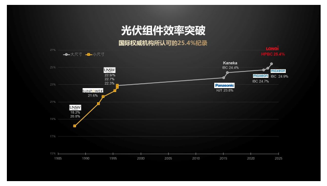 据悉,隆基绿能该项记录将于近日收录进国际权威光伏记录榜《马丁格林组件效率世界历史纪录表》与美国可再生能源实验室(NREL)记录榜中。这是晶硅组件效率世界纪录自1988年收录至今,首次由中国太阳能科技企业创造的世界记录,打破了长达36年海外光伏品牌对晶硅组件效率记录的长期垄断,意味着中国光伏品牌即将首次出现在海外权威晶硅组件效率记录榜中。
