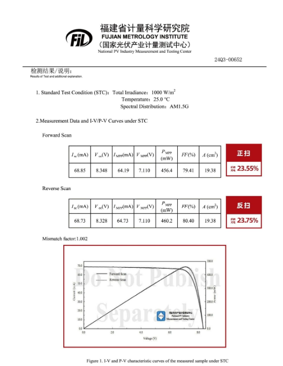 在光伏领域风起云涌的今天,纤纳光电以其独树一帜的技术创新,不断推动钙钛矿产业化向前突破。2024年10月,公司自主研发的冷冻激光修复技术成功助力钙钛矿小组件实现了23.65%(正反扫平均值)的效率并取得福建省计量科学研究院认证证书。