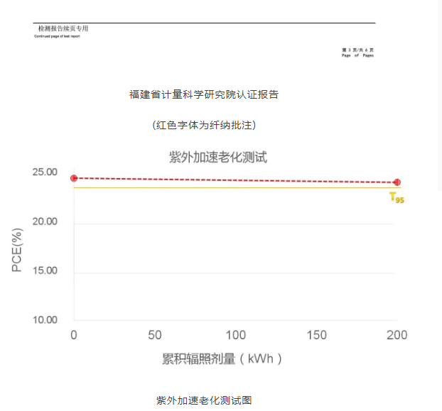 在此基础之上,纤纳光电继续坚持以稳效协同为技术提升的核心指引,坚持效率创纪录,稳定性也要突破,通过更加精准的结晶缺陷修复和界面钝化,消除了钙钛矿薄膜中潜在的快速退化点,进一步提升了电池整体稳定性,在更高效率的技术路线下,实现了比肩传统多晶硅技术的紫外热老化稳定性。