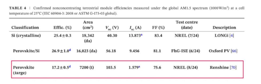 近日,仁烁光能量产的钙钛矿组件(尺寸1200mm*600mm),获得美国可再生能源国家实验室(NREL)稳态效率测试认证,组件的全面积稳态效率达17.2%(对应有效面积效率19.3%),是商用钙钛矿组件全球首次且行业唯一的国际权威认证,该世界纪录效率被最新一期《Solar Cell Efficiency Tables》收录(Version 65)。同时,仁烁光能研制的全钙钛矿叠层光伏组件效率再创新高至24.8%(日本JET认证,面积放大至65 c㎡)。
