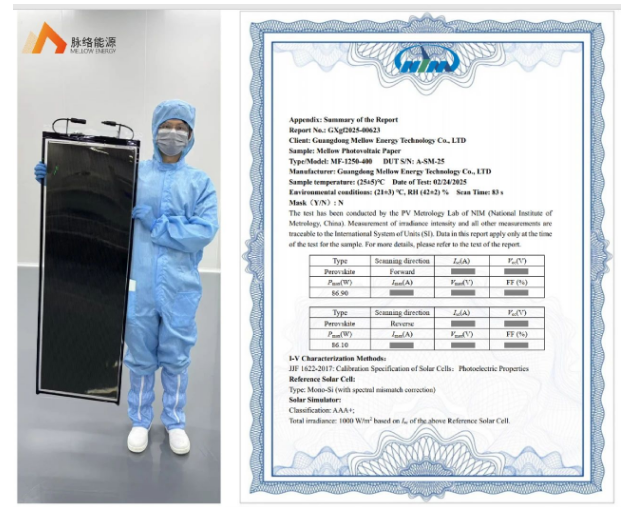 此前,脉络能源已成功实现1.2x1.6m2一体化成型柔性组件制备技术的开发。此次高效率素笺系列产品的认证,预示着脉络能源将可以为市场提供不同尺寸的柔性和弱光钙钛矿光伏组件产品。