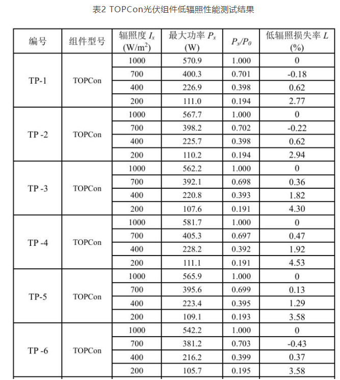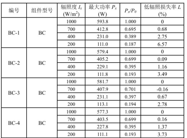 表1 BC光伏组件低辐照性能测试结果