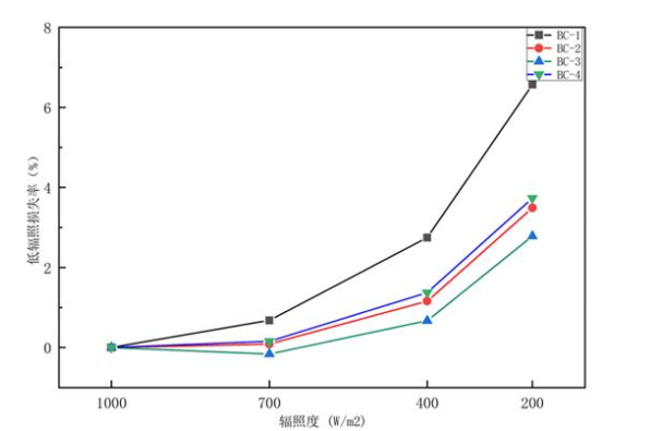 从上面的测试结果可以看出,同为BC组件的4款样品,在低辐照性能上表现出了较大的差异,BC-1样品相较于其他三个样品,低辐照损失率明显较高,在200 W/m2的辐照度下,低辐照度损失率6.57%,相比于BC-3样品的2.78%,高出了1倍以上。同时,从折线图可以看出,随着辐照度的降低,组件的低辐照损失率逐步增大,辐照度越低,不同组件的差异也越发明显。
