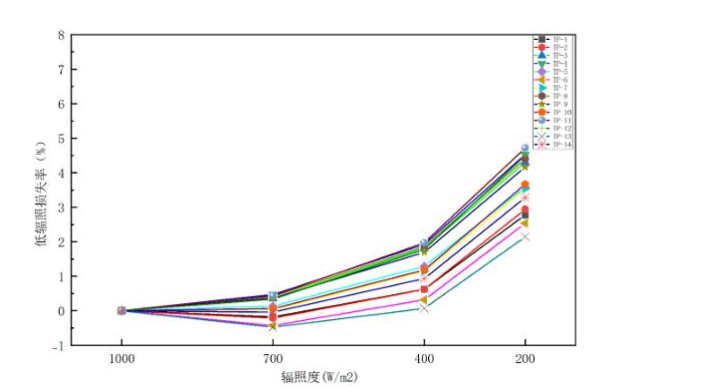 可以看出,不同的TOPCon组件的低辐照性能也存在明显的差异。例如:200 W/m2的辐照度下,低辐照度损失率最小为2.14%,最大为4.72%。这些样品在200 W/m2的辐照度下的平均低辐照损失率达到了3.65%,有5个样品更是达到了4%以上。