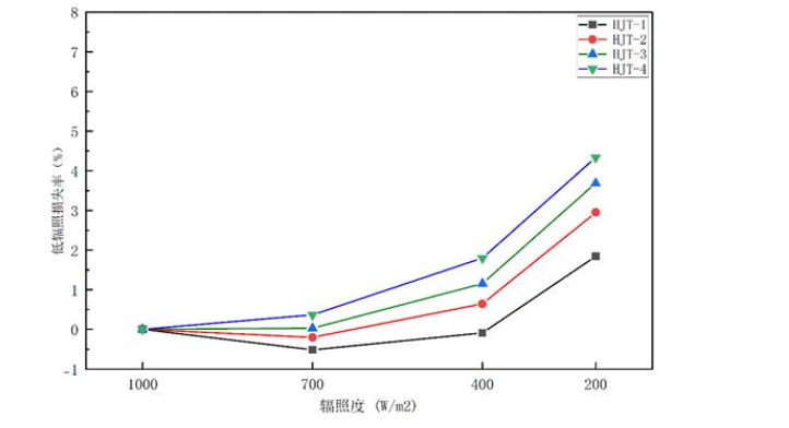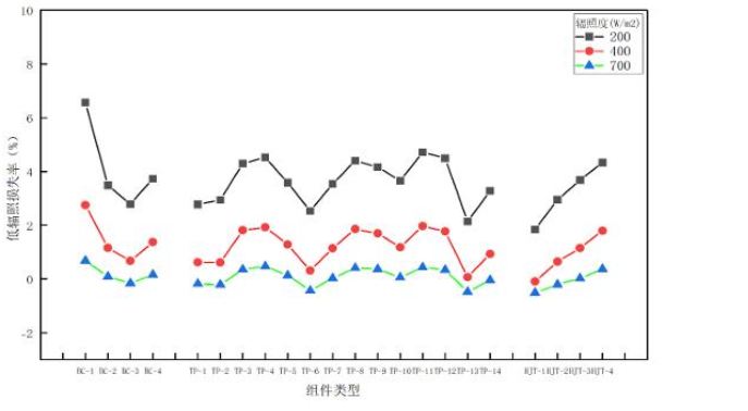 4个HJT组件样品在低辐照度条件下的整体表现略优于TOPCon组件,但也存在像HJT-4这种低辐照损失率较大的产品。而HJT-1样品在700 W/m2,400 W/m2的辐照度条件下,功率损失率为负数,只是在200 W/m2的辐照度下,有较小的功率损失,表现出了较好的低辐照性能。