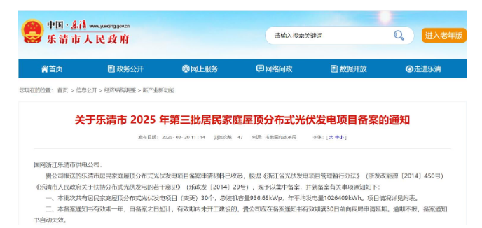 贵公司报送的乐清市居民家庭屋顶分布式光伏发电项目备案申请材料已收悉,根据《浙江省光伏发电项目管理暂行办法》(浙发改能源〔2014〕450号)《乐清市人民政府关于扶持分布式光伏发电的若干意见》(乐政发〔2014〕29号),现予以集中备案,并就备案有关事项通知如下: