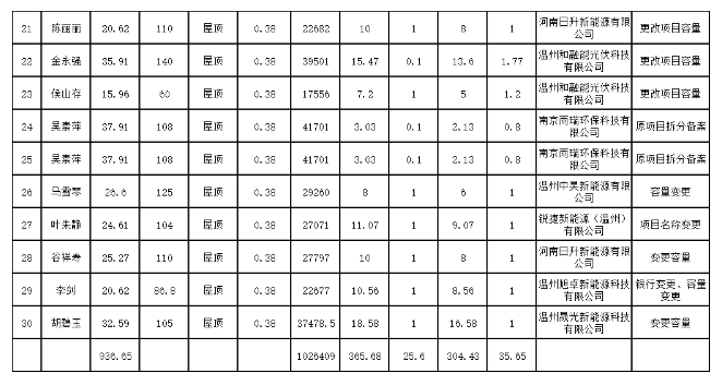 一、本批次共有居民家庭屋顶分布式光伏发电项目(变更)30个,总装机容量936.65kWp,年平均发电量1026409kWh。项目情况详见附表。
