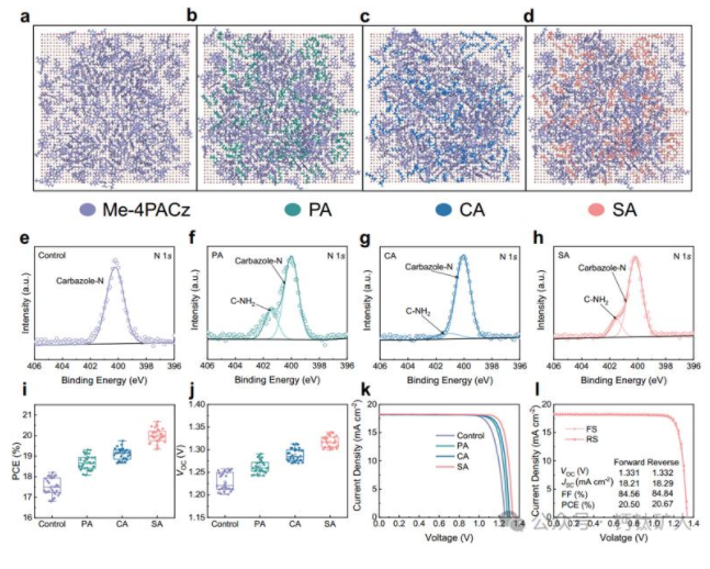 图1:杂化吸附分子的竞争吸附。a–d分子动力学模拟的不同类型混合SAM在ITO/NiOx表面上的吸附平衡俯视图。其中,紫色、绿色、蓝色和粉色分别代表Me-4PACz、PA、CA和SA分子。Me-4PACz、PA-Me-4PACz、CA-Me4PACz和SA-Me-4PACz杂化物的NiOx表面覆盖率分别为0.68、0.76、0.74和0.75。对照、PA、CA和SA样品的e–h XPS N 1 s光谱。1.77eV带隙钙钛矿器件的PCE(i)和VOC(j)的箱图。k反向扫描时冠军对照、PA、CA、SA处理装置的J-V曲线。l基于SA的冠军设备在正向和反向扫描下的J-V曲线。