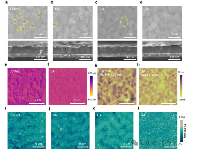 图2:WBG钙钛矿薄膜和埋入界面的优化。a–d分别沉积在对照、PA、CA、SA基基材上的钙钛矿薄膜的俯视图和横截面SEM图像。e、 f分别沉积在对照和SA基基底上的钙钛矿薄膜的表面KPFM结果和g、h AFM图像。i–l分别在控制、PA、CA和SA基基底上沉积的钙钛矿薄膜的 PL图。