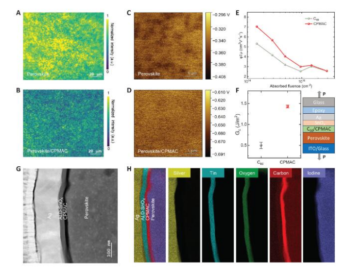 尽管C60通常作为反式钙钛矿太阳能电池中的电子传输层,但其分子特性导致界面结合力较弱,引发非理想的界面电子与机械性能退化。鉴于此,NREL朱凯课题组在期刊《Science》上发文“C60-based ionic salt electron shuttle for high-performance inverted perovskite solar modules”以C60为原料合成了一种离子盐——4-(1',5′-二氢-1'-甲基-2'H-[5,6]富勒烯-C60-Ih-[1,9-c]吡咯-2'-基)苯甲胺氯化物(CPMAC),并将其作为电子传输介质应用于反式钙钛矿太阳能电池中。CPMA阳离子中的CH2-NH3+头部基团有效改善了电子传输层界面性能,其离子特性还增强了分子堆叠密度,使界面韧性较C60提升约3倍。采用CPMAC后,电池在65℃、1个太阳光强度下持续运行2,100小时后,功率转换效率达到约26%,且衰减率仅为~2%。对于迷你组件(四子电池结构,6平方厘米),在55℃运行2,200小时后仍保持约23%的效率,衰减率不足9%。