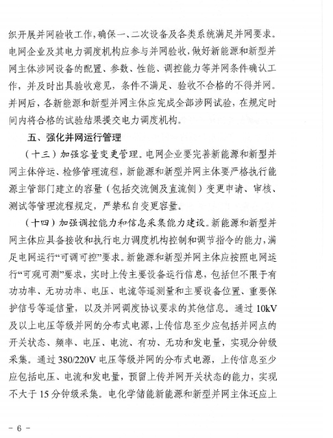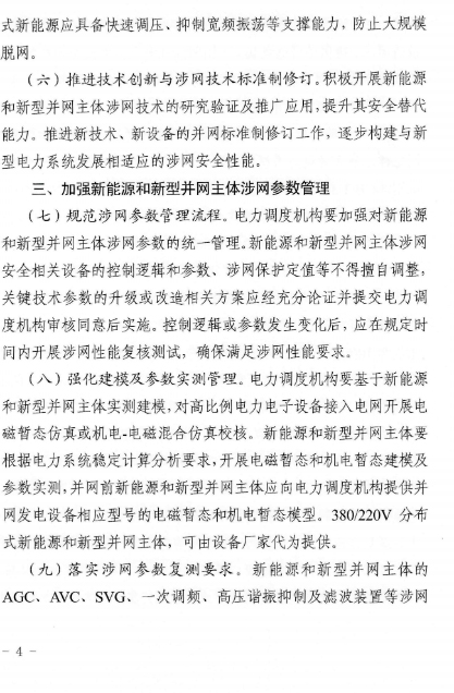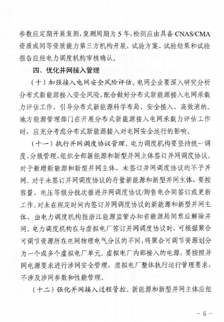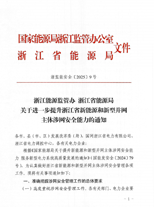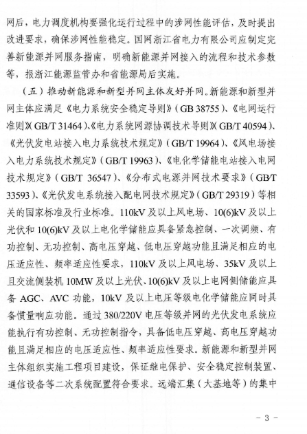 近日,浙江能源监管办、浙江省能源局联合印发了《关于进一步提升浙江省新能源和新型并网主体涉网安全能力的通知》。《通知》围绕提升涉网安全性能,加强新能源和新型并网主体涉网参数管理,优化并网接入管理,强化并网运行管理,开展存量新能源和新型并网主体涉网性能改造等方面,提出了具体的措施和要求。
