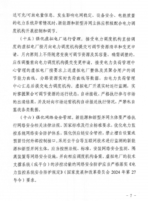 在并网运行管理中,《通知》强调,电化学储能新能源和新型并网主体还应上送可充/可放电量信息。发生影响电网稳定、设备安全、电能质量的电力系统异常情况时,应积极配合电力调度机构开展控制和调节。虚拟电厂开展实时运行监测,实施掌握聚合可调节资源的运行状态,自动接收、严格执行参与市场的出清结果,并及时向市场运营机构自动报送执行情况,严谨私自篡改各类数据。