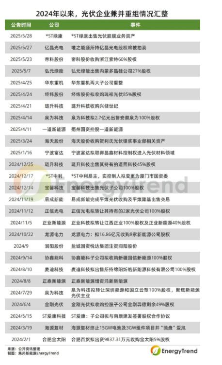 光伏行业市场竞争愈发激烈,企业大多面临着盈利能力下降,资金链紧张等问题,部分企业企图通过剥离非核心或亏损业务以求生存,据集邦新能源EnergyTrend不完全统计,仅2025年5月,弘元绿能、帝科股份、亿晶光电及*ST绿康4家公司发布关于资产重组的公告,由此可见,光伏行业正在进入加速出清阶段。