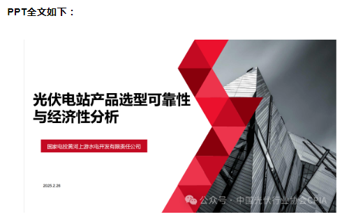 2025年2月26日,由中国光伏行业协会主办的“2025光伏发电项目技术经济性论坛”在北京成功举办。会上,国家电投集团黄河公司党总支书记汪洋作主题为“光伏电站产品选型可靠性与经济性分析”的报告。汪书记详细介绍了国家光伏、储能实证实验平台的基本情况、功能定位以及实证实验方案,并且分享了组件、逆变器、支架等产品的实证分析,并通过数据总结了有关经验,提出了选型建议。