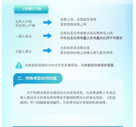 关于上网模式,《实施细则》明确,一般工商业分布式光伏可选择全部自发自用或者自发自用余电上网模式;采用自发自用余电上网的,年自发自用电量占发电量的比例不作要求。