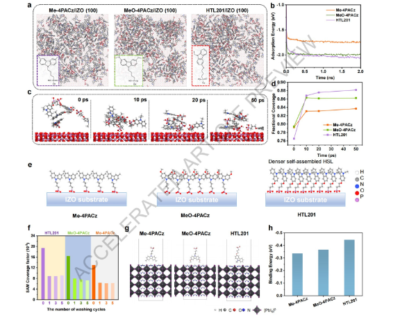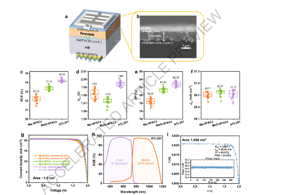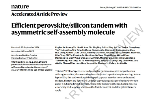 针对空穴传输层所在的界面复合问题,隆基团队联合苏州大学开展研究,在新型有机自组装分子材料(SAM)设计及晶硅-钙钛矿叠层器件取得了突破性进展。有别于传统的SAM材料在咔唑的氮原子上引入膦酸锚定基团,研究人员在咔唑核的苯环侧引入膦酸锚定基团,提出了一种具有非对称结构的自组装分子(HTL201),作为宽带隙钙钛矿子电池的空穴选择层。非对称结构的引入显著增强了SAM的锚定能力,原位提升了SAM在硅绒面衬底的覆盖率及均匀性,优化了界面能级匹配。同时,HTL201与钙钛矿之间的强相互作用促进了高品质钙钛矿薄膜的沉积,并有效钝化了埋底界面缺陷,显著降低了表面界面非辐射复合水平。通过与双面纹理化的异质结晶硅结合,研究团队成功实现了开路电压接近2.0V,且认证效率高达34.6%的晶硅-钙钛矿串联叠层太阳电池。这项研究为新型SAM材料的开发及进一步提升晶硅-钙钛矿叠层效率提供了重要的技术方案。相关研究成果2025年7月7日以“Efficient perovskite/silicon tandem with asymmetric self-assembly molecule”为题,发表于国际顶级学术期刊《Nature》上。