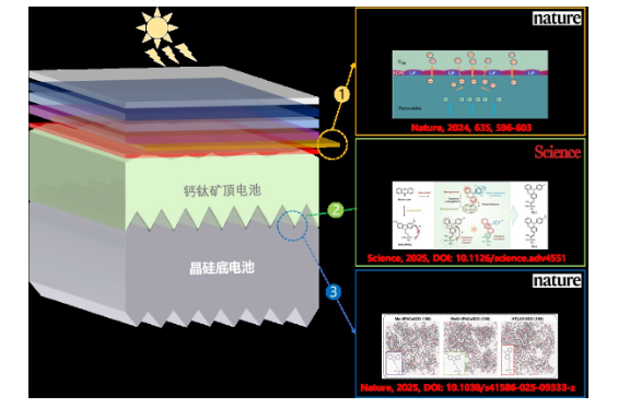 近年来晶硅-钙钛矿叠层太阳电池取得重要进展,但宽带隙钙钛矿顶电池仍然存在显著的界面非辐射复合问题,主要包括钙钛矿上界面与电子传输层的界面复合问题以及空穴传输层在绒面衬底上覆盖性及均匀性不佳引起的界面复合问题等。2024年9月,隆基叠层团队在《Nature》发表文章阐述了通过引入双层交错钝化策略,钙钛矿与电子传输层界面复合问题已得到有效解决,并将晶硅-钙钛矿叠层电池效率提升到33.9%,首次从实验上证明双结叠层太阳能电池效率超过了单结S-Q理论效率极限,具有里程碑意义。