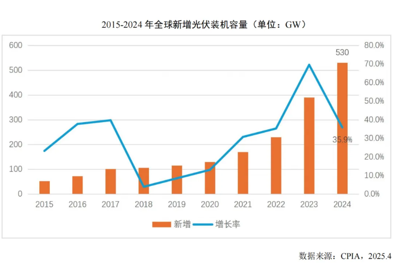 2024年全球光伏市场呈现出蓬勃的发展态势,新增装机容量达到530GW,同比增长35.9%,累计装机容量更是首次突破2TW,高达2076GW。在全球光伏市场中,中国、欧盟、美国作为主要的光伏市场,其新增装机容量合计占比超过70%,而印度、土耳其、沙特、巴基斯坦等新兴市场也展现出了强劲的增长势头,增速超100%。