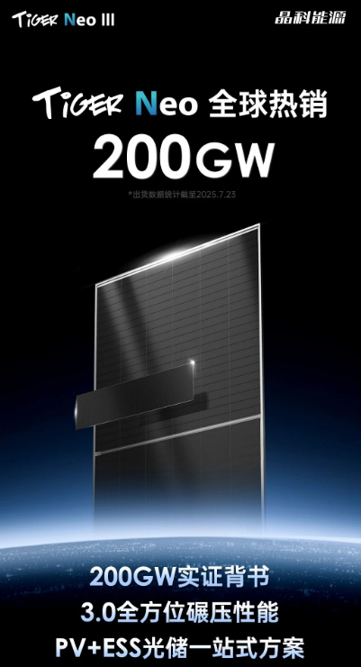 近期,晶科能源Tiger Neo系列组件全球累计出货量正式突破200GW,产品销往168个国家,其中分布式市场占比40%,再次刷新单品出货行业记录,成为史上最畅销组件系列。