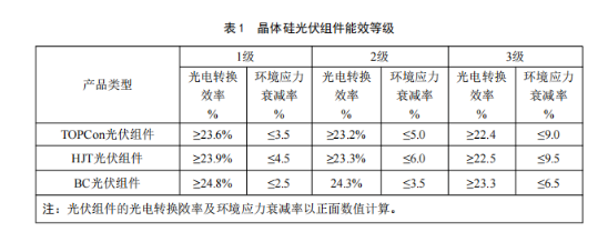晶体硅光伏组件能效等级分为3级,其中1级能效等级最高。各能效等级的光电转换效率不应低于表1的规定,环境应力衰减率不应高于表1的规定。光电转换效率和环境应力衰减率按GB/T 8170的规定进行修约,均保留1位小数。
