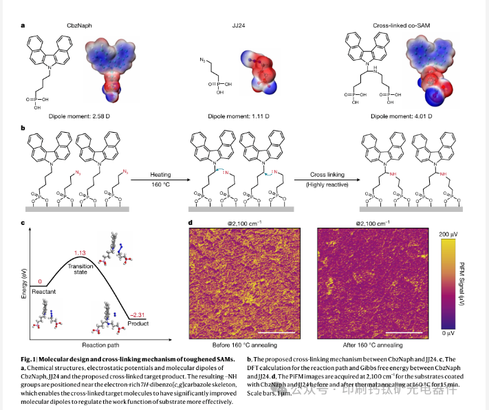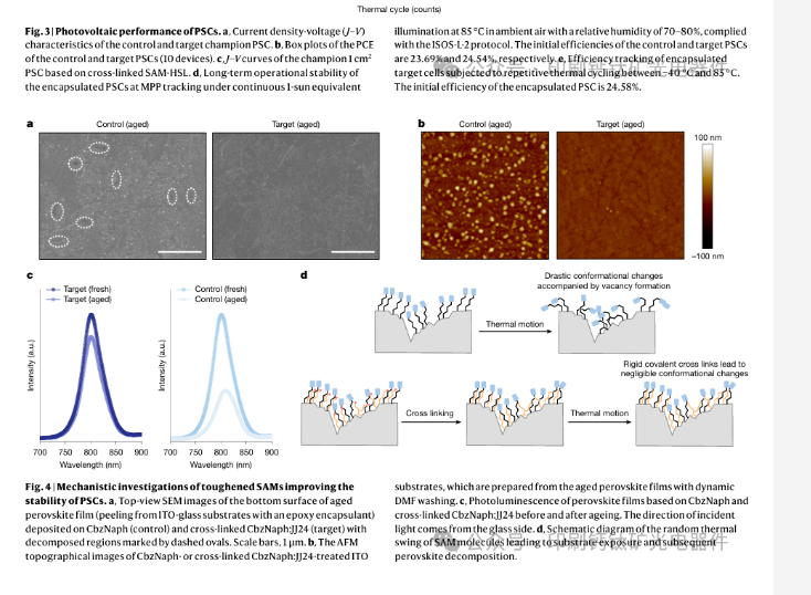 空穴选择性自组装单分子层(SAM)在将反式钙钛矿太阳能电池的认证功率转换效率提高到26.7%方面发挥了关键作用。然而,它们的不稳定性往往会损害器件的运行性能,严重阻碍其实际应用。鉴于此,香港城市大学Alex K.-Y. Jen,中国科学院深圳先进技术研究院张杰,岭南大学吳聖釩,吉林大学蒋青团队在期刊《Nature》发文“Toughened self-assembled monolayers for durable perovskite solar cells”采用可交联的co-SAM来增强空穴选择性SAM对抗外部应力的构象稳定性,同时抑制自组装过程中SAM中缺陷和空隙的形成。含叠氮化物的SAM可以被热活化,形成具有热稳定构象和择优取向的交联致密组装co-SAM。这有效地减少了热应力下松散SAM摆动造成的基底表面暴露,防止了钙钛矿分解。这使得性能最佳的电池实现了26.92%的认证效率,同时还具有出色的热稳定性,在85°C下进行1,000小时的最大功率点跟踪时,其衰减可忽略不计。在-40°C至85°C之间进行700次重复热循环后,它仍能保持初始效率的98%以上,代表了该领域的最先进水平。这项工作深入了解了SAM的退化机制,以指导为采用高粗糙度衬底的基于SAM的器件设计更坚固的掩埋界面,从而实现高效耐用的钙钛矿太阳能电池。