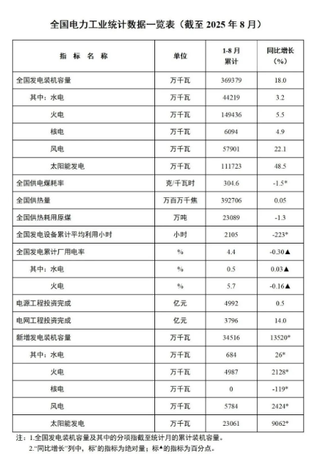 截至8月底,全国累计发电装机容量36.9亿千瓦,同比增长18.0%。其中,太阳能发电装机容量11.2亿千瓦,同比增长48.5%;风电装机容量5.8亿千瓦,同比增长22.1%。1—8月份,全国发电设备累计平均利用2105小时,比上年同期降低223小时。