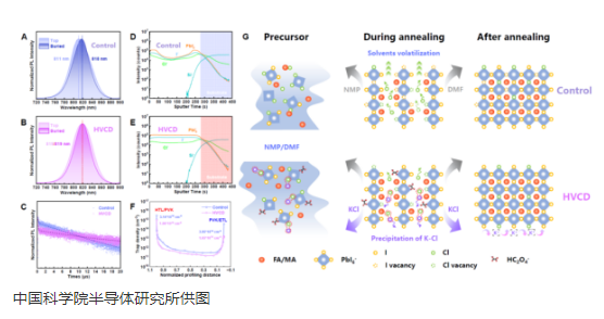 为解决这个问题,科研人员提出了一种能在垂直方向使氯元素均匀化分布的策略。他们在薄膜生长过程中引入碱金属草酸盐,利用其解离出的钾离子与氯离子之间的强结合作用,有效抑制了氯离子的无序迁移,使其在钙钛矿层中均匀分布。