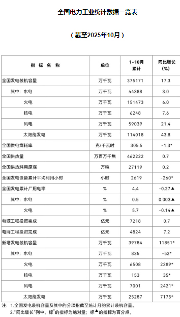 11月24日,国家能源局发布2025年1-10月份全国电力工业统计数据。