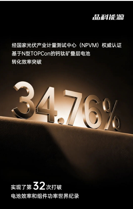 11月27日,全球领先的光伏企业晶科能源宣布,经国家光伏产业计量测试中心(NPVM)权威认证,其基于N型TOPCon的钙钛矿叠层电池转化效率突破34.76%,刷新了此前保持的同类叠层电池34.22%的最高转换效率,实现了第32次打破电池效率和组件功率世界纪录,标志着其在下一代钙钛矿叠层技术领域取得重大进展。