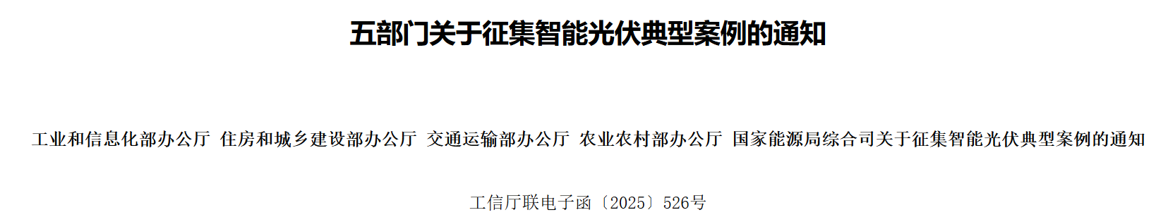 为进一步加快智能光伏技术进步和行业应用,推动能源技术与人工智能、新材料和先进制造技术深度融合,助力我国光伏产业提质升级,12月18日,工业和信息化部、国家能源局等五部门联合发布《关于征集智能光伏典型案例的通知》,征集方向包括但不限于光储融合、建筑光伏、交通运输应用、农业农村应用、光伏制氢 / 氨 / 醇、水上光伏、光伏绿色化、关键信息技术、先进光伏产品、新型设施和实证检测等十大领域。