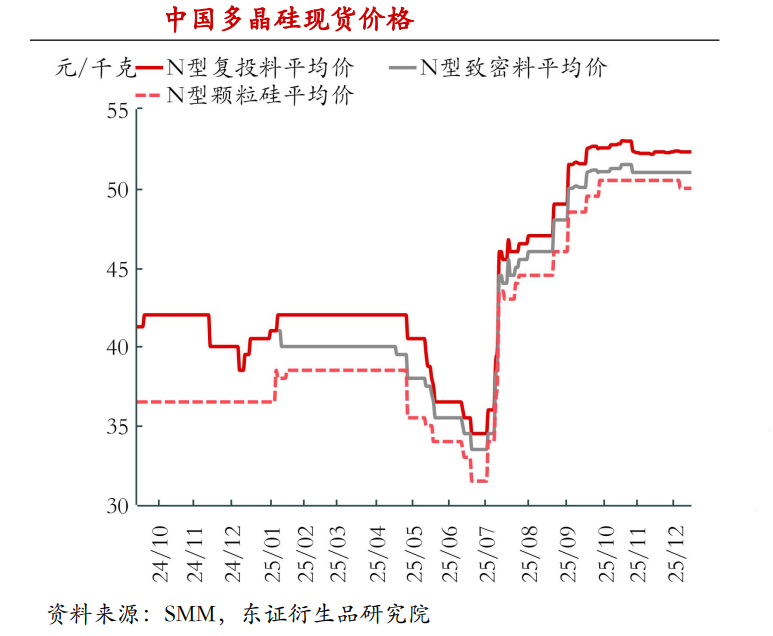 在新产能投放节奏放缓与库存加速消化的双重作用下,多晶硅价格已由2025年7月初最低的35元/kg快速回升至50元/kg以上,初步显现出产能调控的积极效果。
