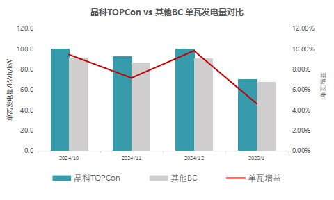 在天气晴朗时,TOPCon 组件凭借可达 80% 的高双面率进一步提升发电量。高双面率的优势尤为突出。当地多为砂石,砂石地面反射率高,能够将更多光线反射至组件背面。高双面率意味着TOPCon 组件可以更有效地捕捉这些反射光,进而大幅提升发电量。在本项目测试时间段内,双面率对于平均单瓦发电量贡献值约6.02%