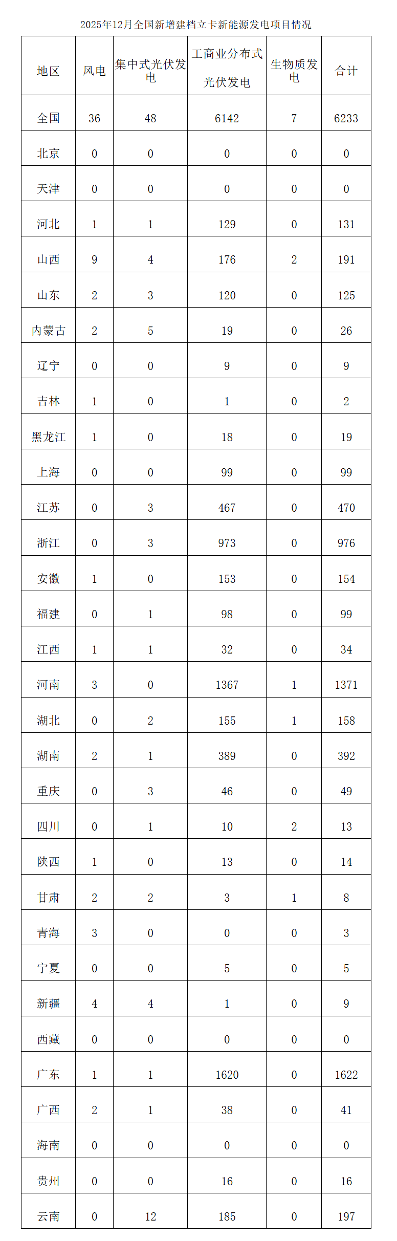 2025年12月,全国新增建档立卡新能源发电(不含户用光伏)项目共6233个,其中风电项目36个,光伏发电项目6190个(集中式光伏发电项目48个,工商业分布式光伏发电项目6142个),生物质发电项目7个。风电、集中式光伏发电、生物质发电项目清单见附件,工商业分布式光伏发电项目清单详见国家可再生能源发电项目信息管理平台网站(网址https://jdlk.renewable.org.cn/card-info-sheet/)。