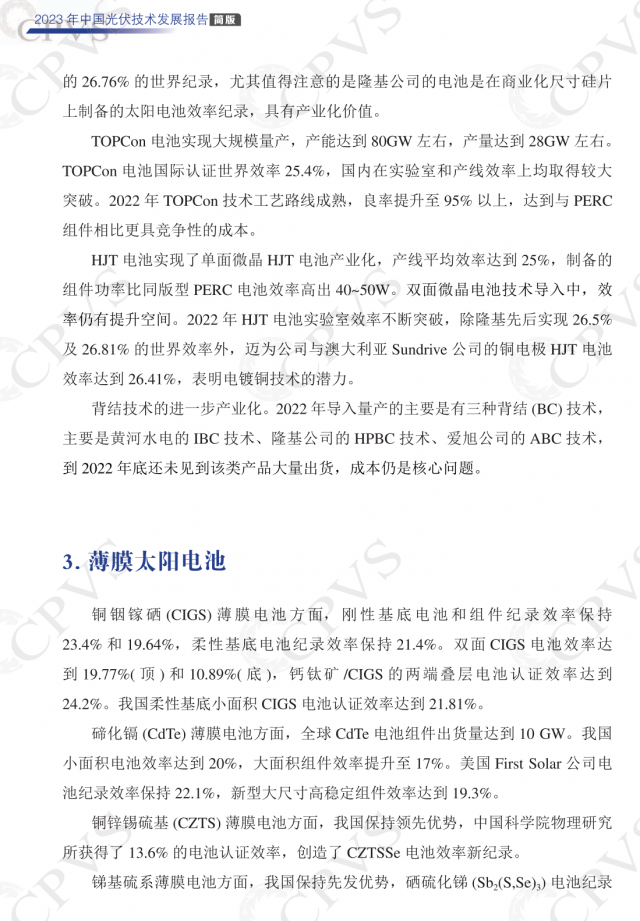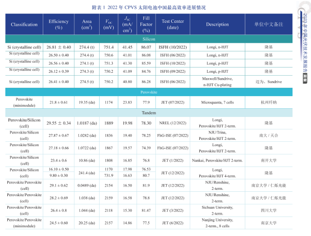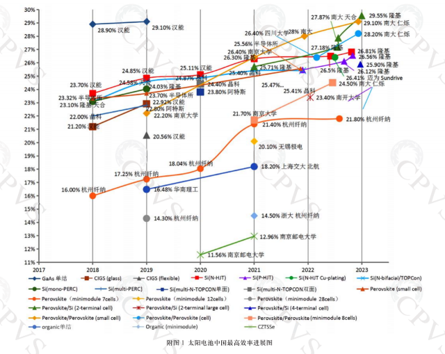 近日,中国可再生能源学会光伏专业委员会发布了《2023中国光伏技术发展报告》,介绍了国内光伏技术2023年的主要进展情况。其中,不同技术路线的最高转换效率如下图。