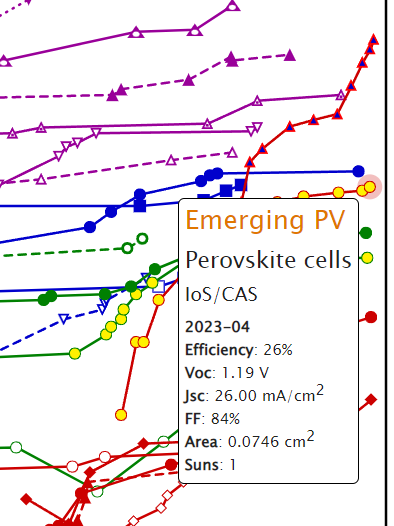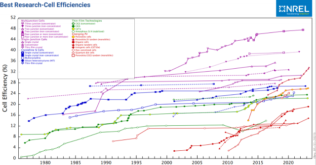 NREL保留了一份图表,显示了一系列光伏技术的研究电池的最高确认转换效率。这是那个图表的互动版本。