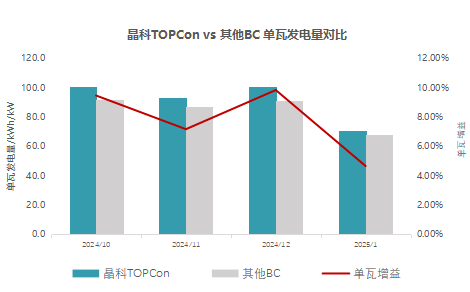 2024年10月至2025年1月,日本阴雨天颇多,晴朗的天气寥寥无几。此低辐照占比较高的天气条件,格外凸显了TOPCon组件 优异的弱光表现。以10月15日到10月29日长达15天的阴雨天为例, 平均每日单瓦增益达到了9.13% !