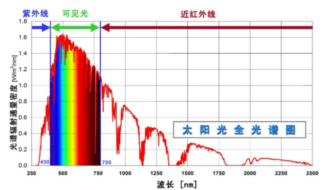 从定义可以很直接的看出,低辐照指的是太阳辐照度的强度低,短波长指的是太阳光中部分光线波长较短。从占比上看,短波长的紫外部分只占太阳光全光谱的5%左右。