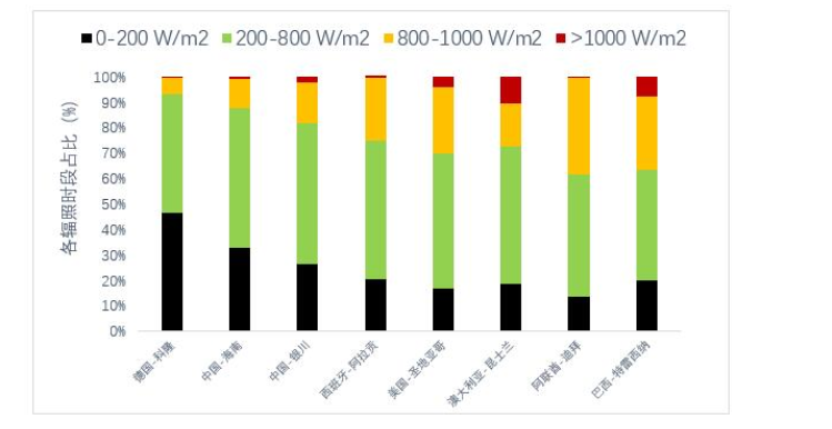 在户外的实际环境中,存在着许多影响太阳辐照度的因素,比如太阳高度,太阳高度在一天中不断变化,太阳高度低时,光线穿过大气的路程较长,其能量衰减也多;再比如天气情况,在多云及阴天情况下,太阳光到达地表要穿过厚厚的云层,而云层对太阳光的辐照度有很强的削弱作用。总之,正常地表太阳辐照度往往很难达到1000W/m²。以下为全球多个地区的太阳辐照度统计表,可以看出,一般地区90%以上的时间实际太阳辐照度都低于标准太阳辐照度,处于低辐照状态。
