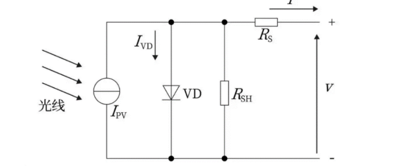 要搞清楚低辐照下光伏组件的输出性能为什么会降低,要从光伏组件的二极管模型谈起,下图是光伏组件二极管模型的等效电路,图中Ipv是光生电流,即太阳能电池在光照下产生的电流,Ivd是二极管分流电流,Rs和Rsh分别是串联电阻、并联电阻,I和V分别是最终输出的电流、电压。