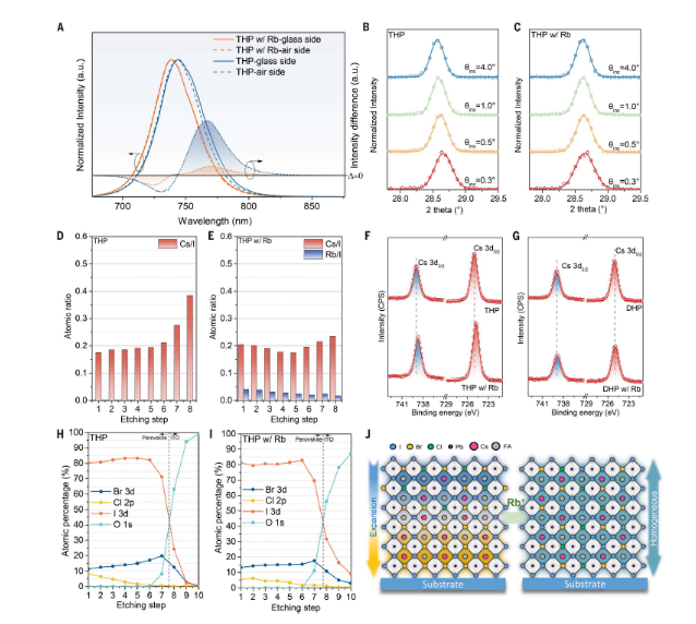 多尺度材料表征,阐明了Rb+掺杂在改善钙钛矿薄膜面内以及面外方向上组分均匀性中的核心作用。进一步通过荧光量子产率测试,观察到Rb+掺杂大幅增强了宽带隙钙钛矿的准费米能级分裂,揭示了器件开路电压的提升机理。