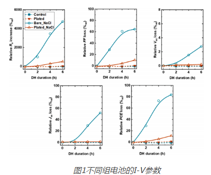 图1展示了不同组电池的I-V参数。对照组试样(Control组)性能保持稳定,表明高温高湿的湿热环境本身不会引起TOPCon电池性能退化。通常情况下,电池在湿热环境下的性能退化主要归咎于水汽、热量以及其他污染物的共同作用。其中,钠离子是最值得关注的污染物,可能会导致电池输出功率、填充因子和开路电压的下降。