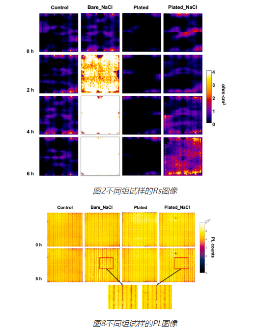 仅经历2小时湿热实验后,Bare_NaCl试样就出现了明显的Rs问题,在湿热实验4小时和6小时后,情况进一步恶化。同时,在湿热实验后,Rs图像显示Plated_NaCl试样也出现了轻微变化,但与Bare_NaCl试样相比,Plated-NaCl试样的性能要稳定得多。相比之下,Plated_NaCl试样的PL图像在接触区域周围明显更亮,这与I-V测量得出的Voc性能更稳定的结果高度一致。
