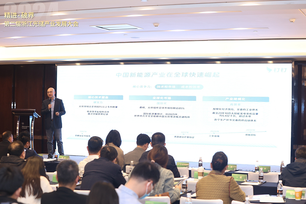 浙江省经信厅数字经济处三级调研员楼伟在致辞中为光储企业提出三点建议:一是要加大技术创新力度,加强与国内外知名企业和研究机构的合作,推动关键核心技术的攻关突破;二是要加强产业链协同发展,产业链上下游企业要加强协同配合,形成产业集群效应,提高产业整体竞争力;三是要拓展市场空间,积极开拓国内外市场,加强国际合作,推动光储产品和技术走出国门。