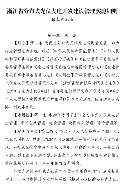 关于公开征求《浙江省分布式光伏发电开发建设管理实施细则(征求意见稿)》意见建议的通知