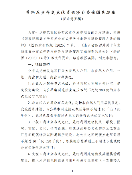 10月29日,浙江省嘉兴市秀洲区发展和改革局发布公告表示,《秀洲区分布式光伏发电项目备案服务指南》在公示期间,未收到意见建议。 征集意见稿如下: